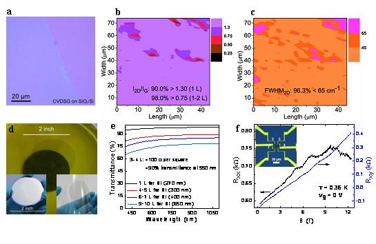 蘇州格瑞豐技術團隊,提出了一種新的合成技術,解決了石墨烯層數(shù)可控制備問題。傳統(tǒng)的以Ni膜為催化劑的CVD制備石墨烯過程中,碳源分解、滲碳和石墨烯薄膜形成過程同時進行,并且冷卻過程中的晶界碳沉淀導致石墨烯薄膜的高度不均勻,無法實現(xiàn)層數(shù)可控制備。他們通過引入氫氣刻蝕過程調節(jié)碳的含量抑制晶界沉淀,并將傳統(tǒng)的CVD分解為CVD滲碳、氫氣刻蝕和冷卻偏析分步過程,在多晶Ni薄膜表面實現(xiàn)了晶圓尺寸的層數(shù)可控、厚度均勻的高質量石墨烯的偏析生長(圖1)。通過改變金屬膜的厚度、氣體滲碳量、氫氣刻蝕量,石墨烯的層數(shù)可以得到精確的控制 (圖2)。他們合成的3–4層石墨烯(CVDSG)的室溫遷移率約為3000 cm2V-1s-1,其層間扭曲的少層石墨烯薄膜具有優(yōu)異的透明導電性能,它在透光率為90%時的方塊電阻約為100 Ω/□。此方法工藝簡單可控,很有希望成為石墨烯面向應用的制備的主流技術。相關結果已發(fā)表在Adv. Funct. Mater. 2012, 22, 3153–3159。