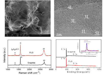高質(zhì)量薄層石墨烯(Few-layergraphene,GRF系列)是公司具有技術(shù)優(yōu)勢的品牌產(chǎn)品。高質(zhì)量薄層石墨烯幾乎不含任何官能基團和拓撲缺陷,厚度分布在1-10原子層,保持原始石墨片層的極好晶化質(zhì)量,完好的層內(nèi)sp2結(jié)構(gòu)及優(yōu)異的導電、導熱性能。掃描電子顯微鏡(SEM)和投射電子顯微鏡(TEM)顯示了超薄的石墨烯片層結(jié)構(gòu),Raman和XPS顯示了高晶化質(zhì)量。