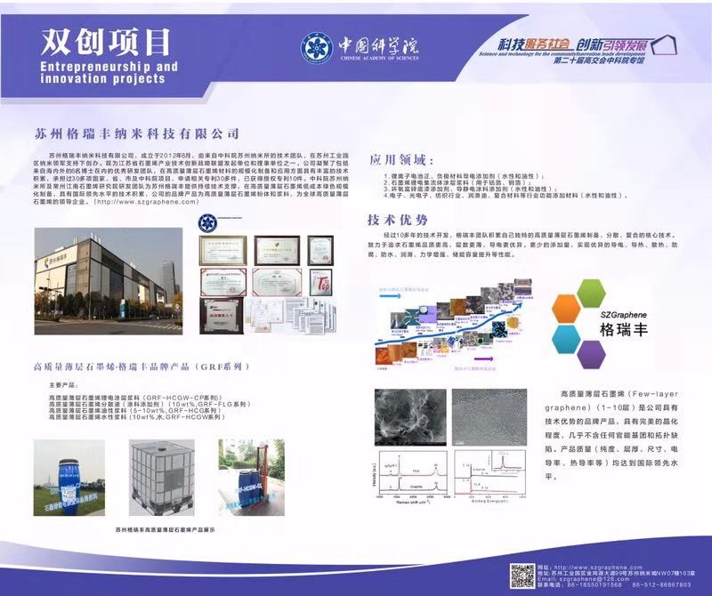 本屆高交會上,蘇州格瑞豐納米科技有限公司(SZGraphene)的高質(zhì)量薄層石墨烯(GRF)亮相中國科學院展區(qū),展示了高質(zhì)量薄層石墨烯的產(chǎn)品及在鋰電、涂料,導電、導熱、散熱方面的應用,吸引了媒體、觀眾及應用行業(yè)的廣泛關注。多家企業(yè)與我公司就石墨烯產(chǎn)品進行深入交流,初步了解了各項技術或產(chǎn)品的概況、指標及市場前景,并交流后續(xù)合作意向。