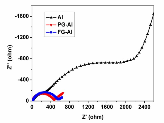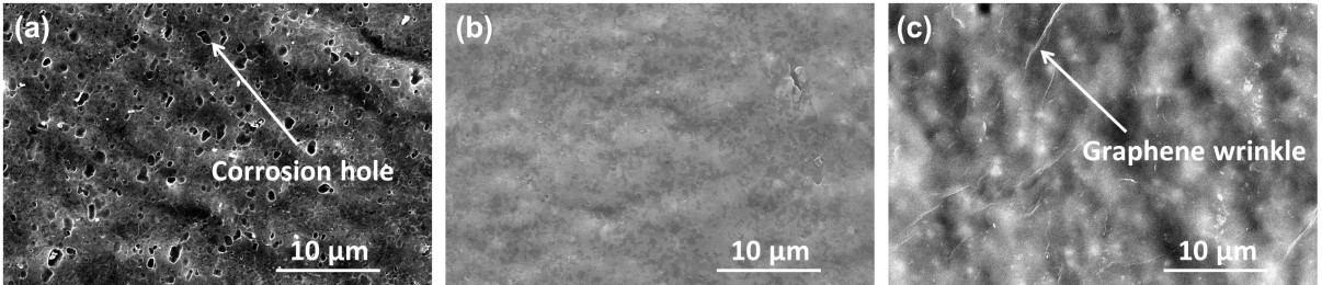 圖1. (a)光鋁箔/碳材料,500-1000次充放電循環(huán)均出現(xiàn)腐蝕坑, (b-c)500-1000次充放電循環(huán),石墨烯集流體涂層完好,幾乎無腐蝕腐蝕。