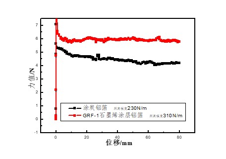 圖2. 石墨烯(格瑞豐)集流體涂層和傳統(tǒng)涂碳鋁箔集流體涂層的LFP電池極片剝離力對比,高質(zhì)量薄層石墨烯的集流體涂層表現(xiàn)更好的剝離力。