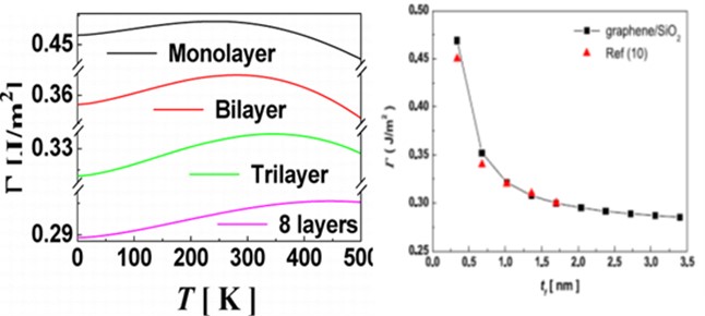 圖1. 理論和實(shí)驗(yàn)測(cè)試的不同厚度石墨烯-SiO2襯底之間的界面粘結(jié)力,薄層石墨烯具有更強(qiáng)的界面粘結(jié)力。