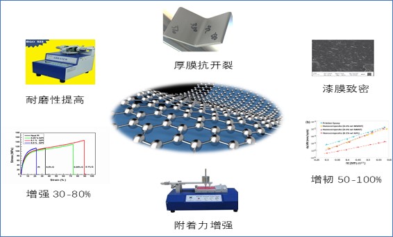 圖3. 石墨烯的界面粘結(jié)力強(qiáng)化涂料漆膜的抗開裂、增強(qiáng)增韌、附著力,以及耐磨性等力學(xué)性能。