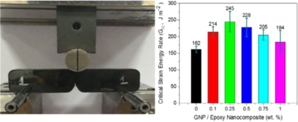 斷裂韌性(Fracture toughness)是表征材料阻止裂紋擴(kuò)展的能力,可用臨界應(yīng)變能釋放率GIC表示材料的韌性好壞的一個(gè)定量指標(biāo)。在環(huán)氧樹脂中少量加入石墨烯0.1-0.3wt%,能夠把環(huán)氧斷裂韌性增加50-100%。這些增加與石墨烯片層結(jié)構(gòu),高比表面積,石墨烯-環(huán)氧界面粘結(jié)力貢獻(xiàn)大,它們之間van de Waals相互作用能夠有效的促進(jìn)聚合物基體到石墨烯填料的壓力傳遞和荷載轉(zhuǎn)移,并在環(huán)氧體系中形成一個(gè)個(gè)石墨烯孤島,有效抑制斷裂增長(zhǎng)[8-9]。