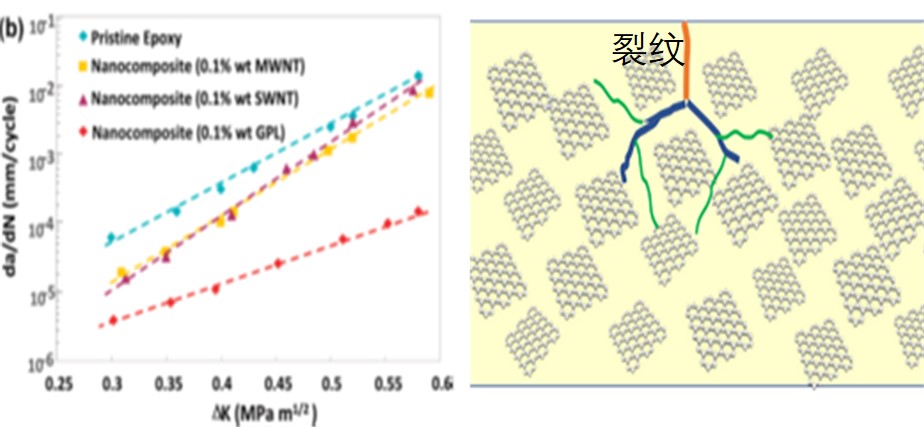圖5.石墨烯抑制裂紋擴(kuò)展,幾種材料裂紋擴(kuò)展數(shù)率對(duì)比(左圖)。增韌抗開裂“石墨烯孤島”機(jī)理,漆膜中形成均勻分散的孤島,延長(zhǎng)裂紋路徑,阻礙裂紋蔓延(右圖)。