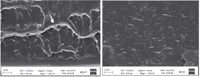 圖6. 純環(huán)氧樹脂(左圖)和加入0.8wt%石墨烯的環(huán)氧樹脂截面SEM對(duì)比圖片[10]。