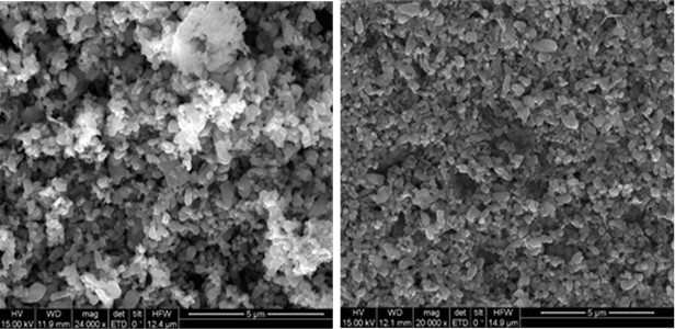圖7.純的無機(jī)填料的SEM圖片,無機(jī)填料之間出現(xiàn)明顯二次團(tuán)聚(左圖)。右圖為添加0.5wt%石墨烯的無機(jī)復(fù)合填料,分散更均勻,更致密。