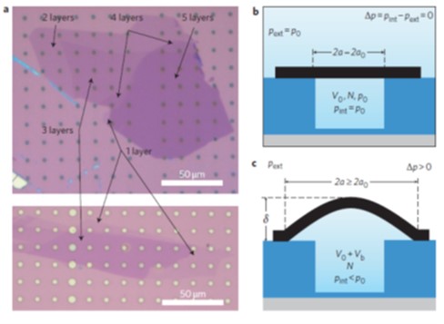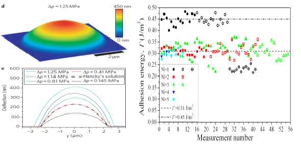 圖9.加壓氣泡方法測(cè)試石墨烯界面粘結(jié)力0.45 J/m2,2-5層石墨烯逐步降低到~0.34-0.30 J/m2。