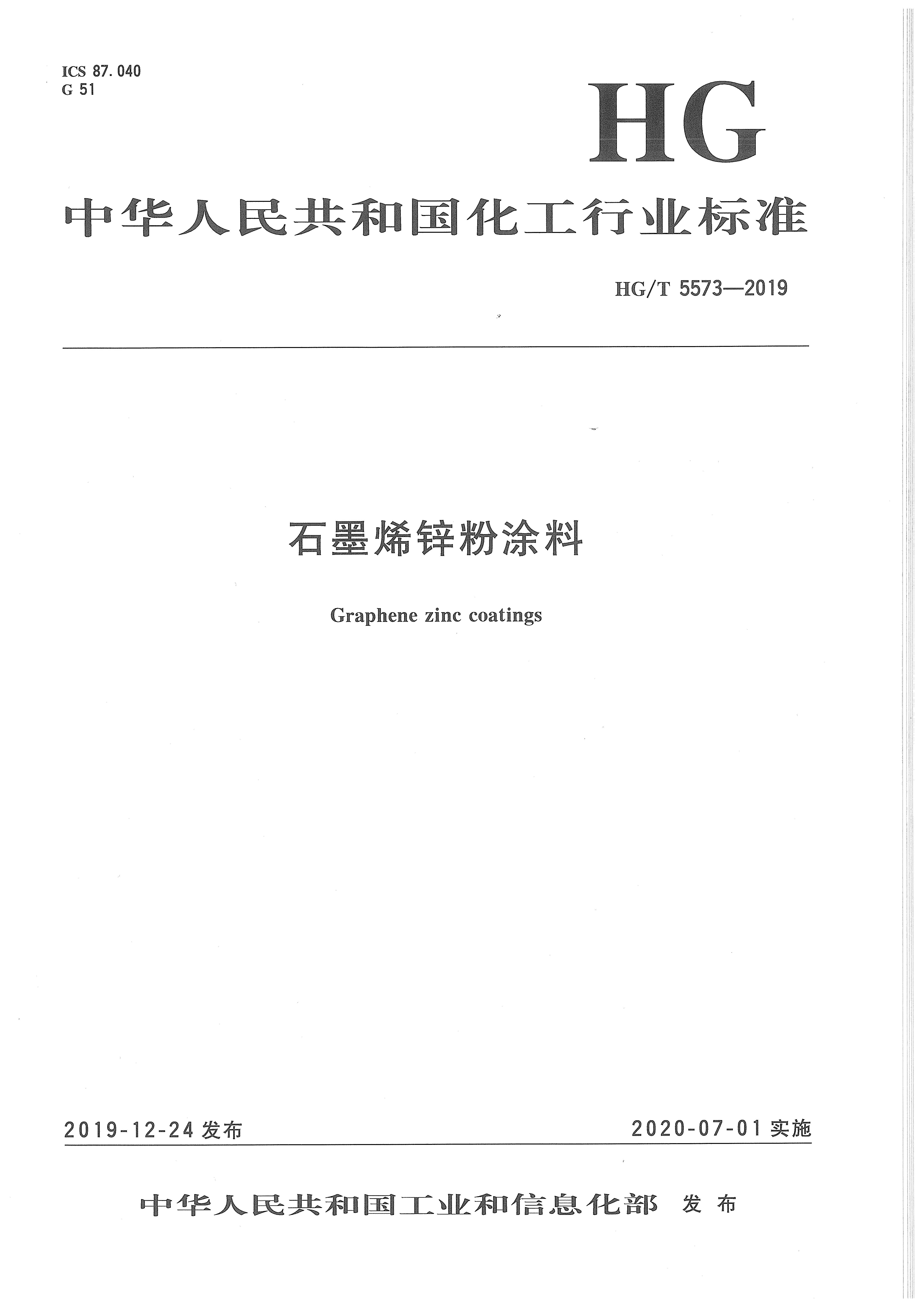 2019年10月12日,工信部公布《石墨烯鋅粉涂料》(HG/T 5573-2019)行業(yè)標(biāo)準(zhǔn)。