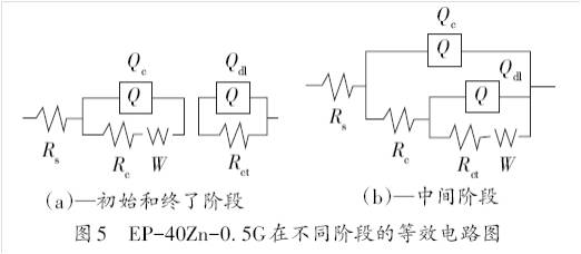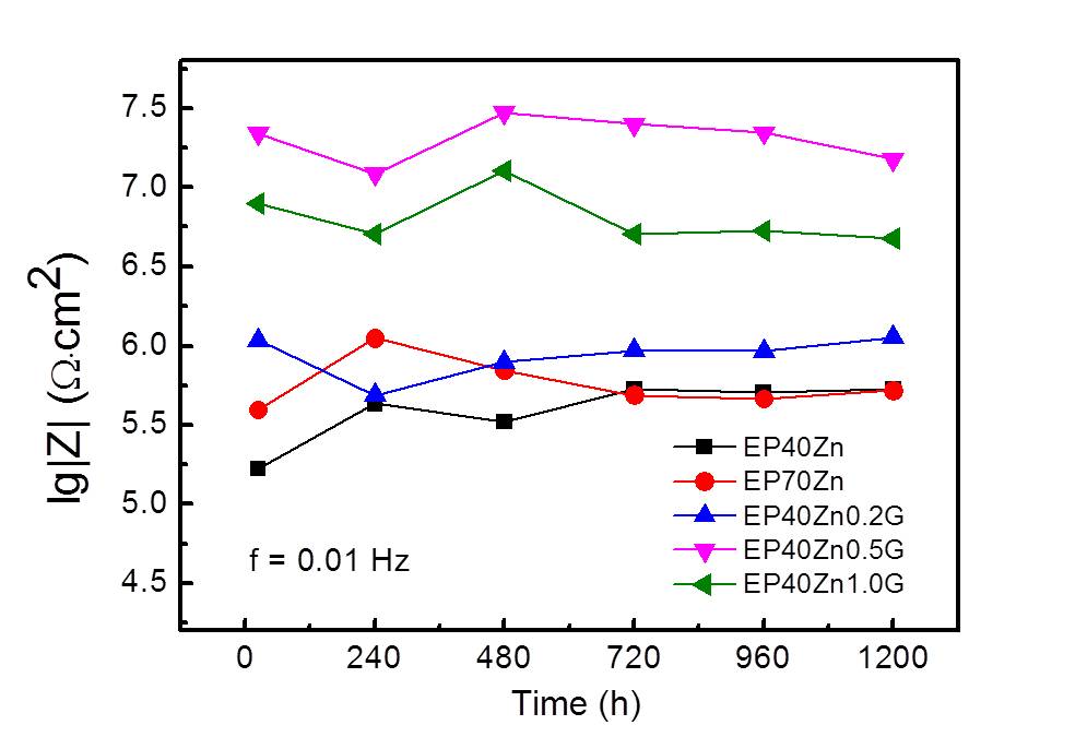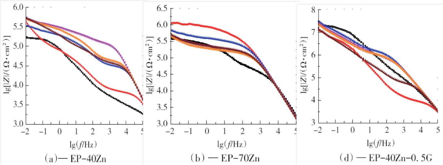 引入了一定量的石墨烯的涂層EP-40Zn-0. 5G和EP-40Zn-1.0G,顯著延長(zhǎng)了腐蝕介質(zhì)擴(kuò)散輸運(yùn)的路徑,因此對(duì)應(yīng)的低頻阻抗模量較前3個(gè)試樣提升了10~30倍,涂層的阻隔性能得到明顯提升。腐蝕介質(zhì)需要更長(zhǎng)的時(shí)間才能完全滲透涂層,因此240h時(shí)對(duì)應(yīng)的低頻阻抗模量也有明顯降低。